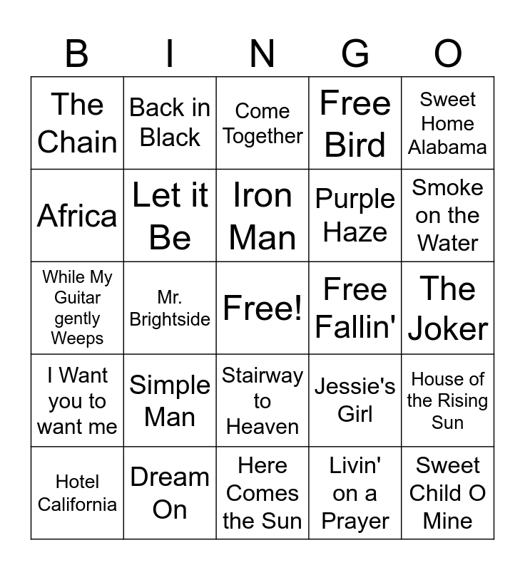 This bingo card has a free space and 24 words: Simple Man, Dream On, Iron Man, Hotel California, Sweet Home Alabama, The Chain, Africa, Back in Black, Free Fallin', Stairway to Heaven, Purple Haze, While My Guitar gently Weeps, Jessie's Girl, House of the Rising Sun, Let it Be, Livin' on a Prayer, The Joker, Come Together, Smoke on the Water, Mr. Brightside, Sweet Child O Mine, I Want you to want me, Free Bird and Here Comes the Sun.