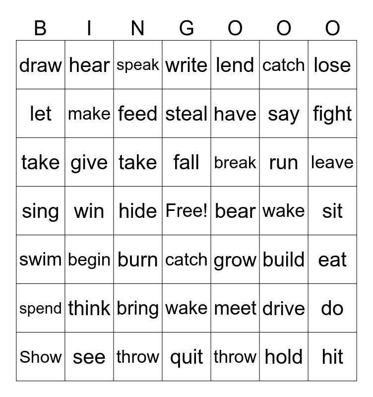 This bingo card has a free space and 62 words: Show, see, teach, quit, break, buy, lose, go, give, throw, write, grow, catch, sit, spend, hear, speak, steal, ride, say, leave, draw, think, take, know, drive, eat, drink, begin, hide, feel, bear, come, hit, let, make, bring, wake, lend, run, fight, sing, win, tear, fall, have, build, do, swim, read, feed, catch, meet, hold, tell, take, fly, burn, bite, throw, wake and choose.