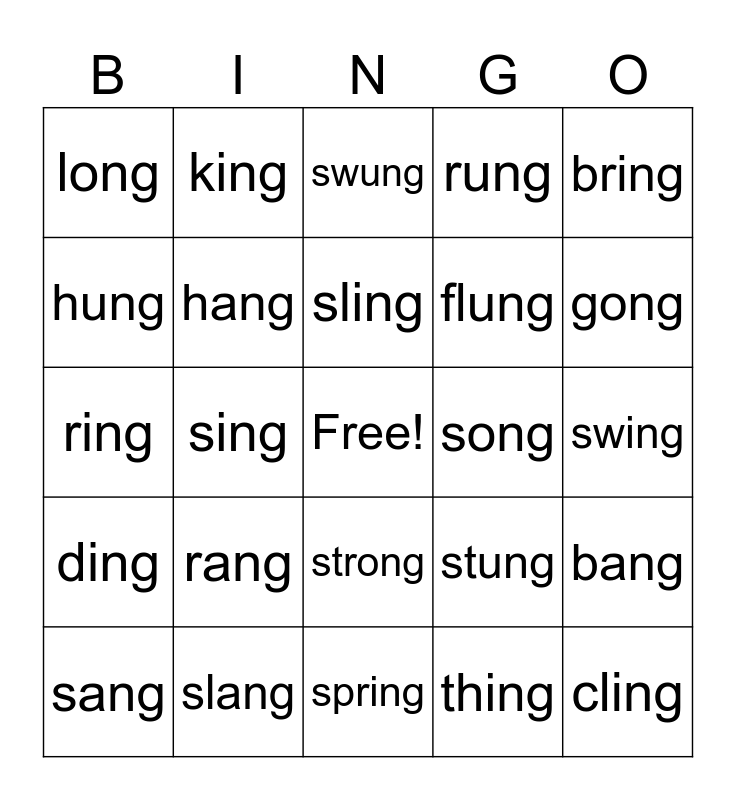 This bingo card has a free space and 24 words: rang, slang, sling, sang, bring, long, hung, king, song, strong, flung, ring, stung, bang, hang, thing, swing, swung, gong, sing, cling, ding, rung and spring.
