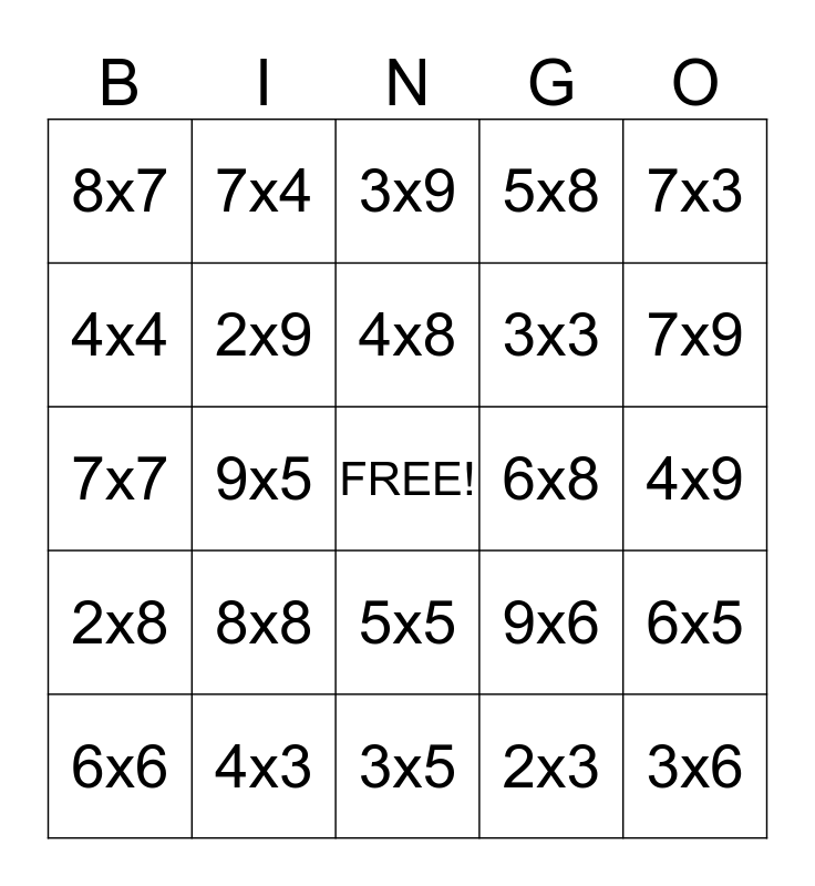 This bingo card has a free space and 34 words: 2x7, 2x3, 2x4, 2x6, 2x8, 2x9, 7x3, 6x6, 7x4, 3x8, 4x8, 3x9, 6x6, 6x7, 6x8, 7x9, 4x3, 7x7, 8x8, 9x6, 5x5, 7x5, 8x7, 4x9, 3x5, 3x6, 5x8, 9x9, 3x3, 4x4, 8x9, 9x5, 6x5 and 2x2.