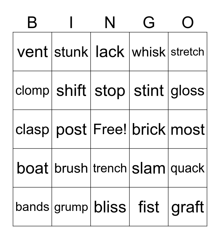 This bingo card has a free space and 40 words: milk, clasp, grind, shift, grump, trench, stop, thrust, stretch, boat, post, whisk, graft, most, brick, brush, grin, vent, shelf, lack, quack, fist, stint, clomp, stunt, slept, shrink, grunted, punches, lamp, cliff, bands, sniff, slam, gloss, bliss, toss, which, stunk and spring.