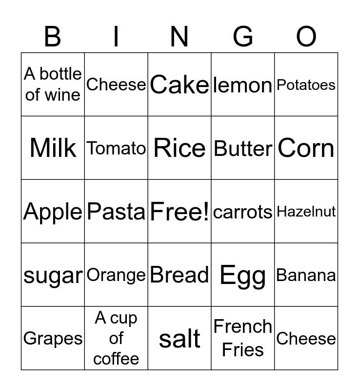 This bingo card has a free space and 24 words: Orange, A cup of coffee, Rice, Grapes, Potatoes, A bottle of wine, Milk, Cheese, carrots, Bread, Butter, Apple, Egg, Banana, Tomato, French Fries, Hazelnut, Cake, Corn, Pasta, Cheese, sugar, lemon and salt.
