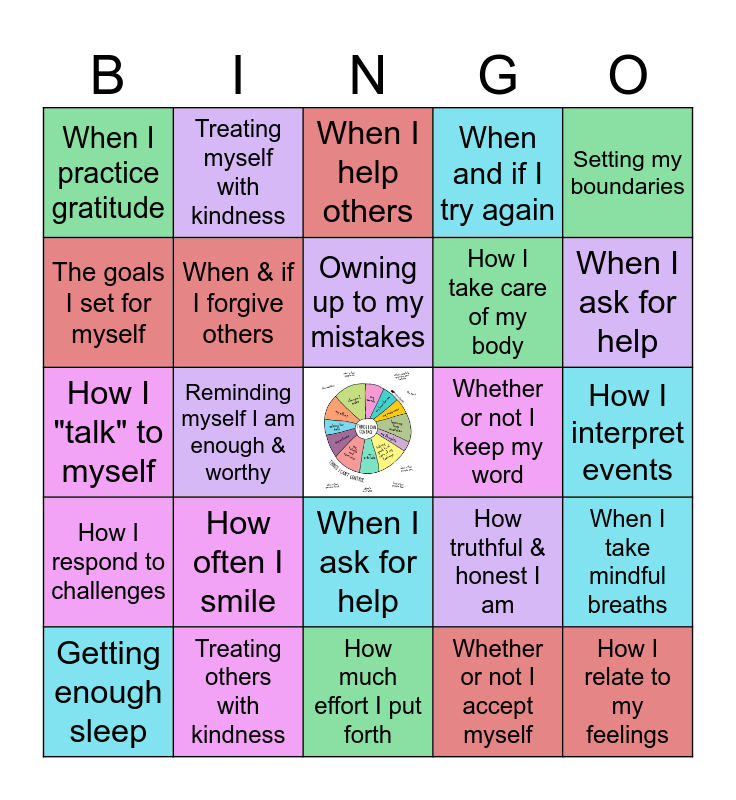 This bingo card has a free space and 24 words: Getting enough sleep, How often I smile, Owning up to my mistakes, Whether or not I accept myself, Setting my boundaries, When I practice gratitude, Treating myself with kindness, When I help others, Whether or not I keep my word, How I interpret events, How I "talk" to myself, When & if I forgive others, How truthful & honest I am, When I take mindful breaths, The goals I set for myself, Treating others with kindness, How much effort I put forth, When and if I try again, When I ask for help, How I respond to challenges, Reminding myself I am enough & worthy, When I ask for help, How I take care of my body and How I relate to my feelings.