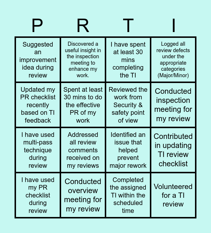 This bingo card has 16 words: I have used my PR checklist during review, Conducted overview meeting for my review, I have spent at least 30 mins completing the TI, Logged all review defects under the appropriate categories (Major/Minor), Updated my PR checklist recently based on TI feedback, Discovered a useful insight in the inspection meeting to enhance my work., Identified an issue that helped prevent major rework, Contributed in updating TI review checklist, Suggested an improvement idea during review, Spent at least 30 mins to do the effective PR of my work, Completed the assigned TI within the scheduled time, Conducted inspection meeting for my review, I have used multi-pass technique during review, Addressed all review comments received on my reviews, Reviewed the work from Security & safety point of view and Volunteered for a TI review.