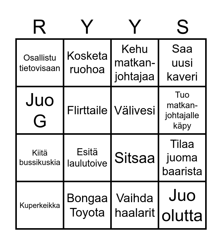 This bingo card has 16 words: Bongaa Toyota, Tilaa juoma baarista, Kehu matkan-johtajaa, Osallistu tietovisaan, Kiitä bussikuskia, Kosketa ruohoa, Sitsaa, Vaihda haalarit, Juo G, Flirttaile, Kuperkeikka, Saa uusi kaveri, Esitä laulutoive, Tuo matkan-johtajalle käpy, Välivesi and Juo olutta.
