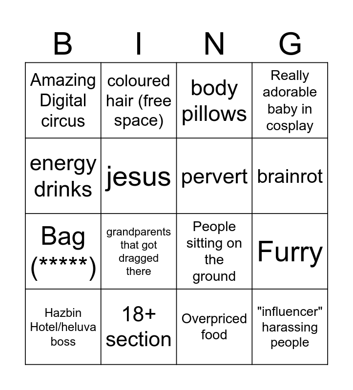 This bingo card has 16 words: 18+ section, Furry, body pillows, Amazing Digital circus, Bag (*****), coloured hair (free space), People sitting on the ground, Overpriced food, energy drinks, jesus, Hazbin Hotel/heluva boss, Really adorable baby in cosplay, grandparents that got dragged there, brainrot, pervert and "influencer" harassing people.