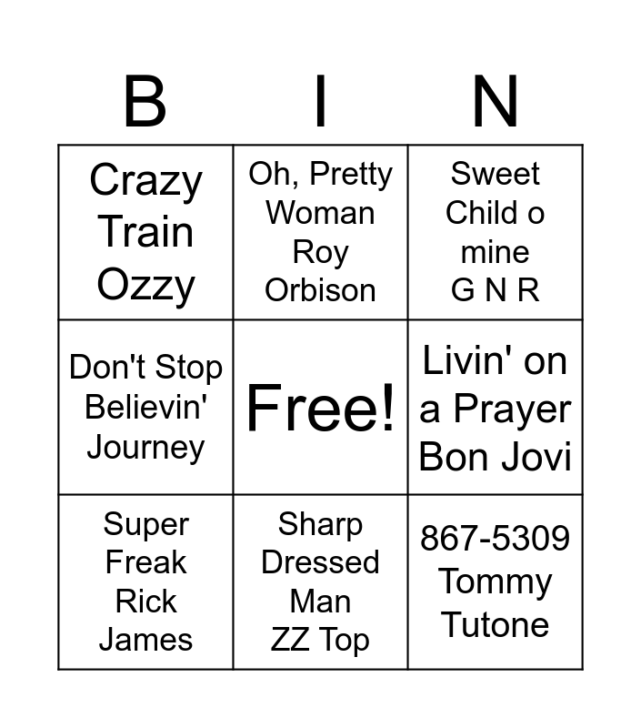 This bingo card has a free space and 17 words: Billie Jean Michael Jackson, Footloose Kenny Loggins, Sweet Child o mine G N R, Crazy Train Ozzy, Thunderstruck AC/DC, Don't Stop Believin' Journey, The Final Countdown Europe, Super Freak Rick James, Sharp Dressed Man ZZ Top, Livin' on a Prayer Bon Jovi, Hurts so Good John Mellencamp, Low Rider War, 867-5309 Tommy Tutone, Oh, Pretty Woman Roy Orbison, Sweet Caroline Neil Diamond, Louie Louie Kingsmen and Tequila The Champs.