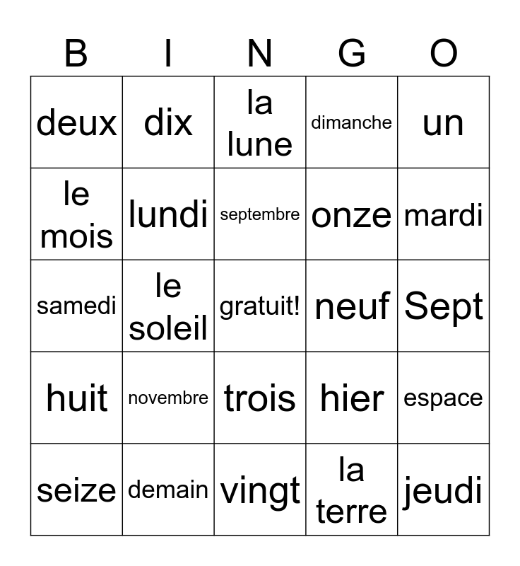 This bingo card has a free space and 24 words: novembre, demain, septembre, seize, un, deux, le mois, dix, neuf, trois, onze, samedi, hier, espace, lundi, la terre, Sept, la lune, mardi, le soleil, jeudi, huit, dimanche and vingt.