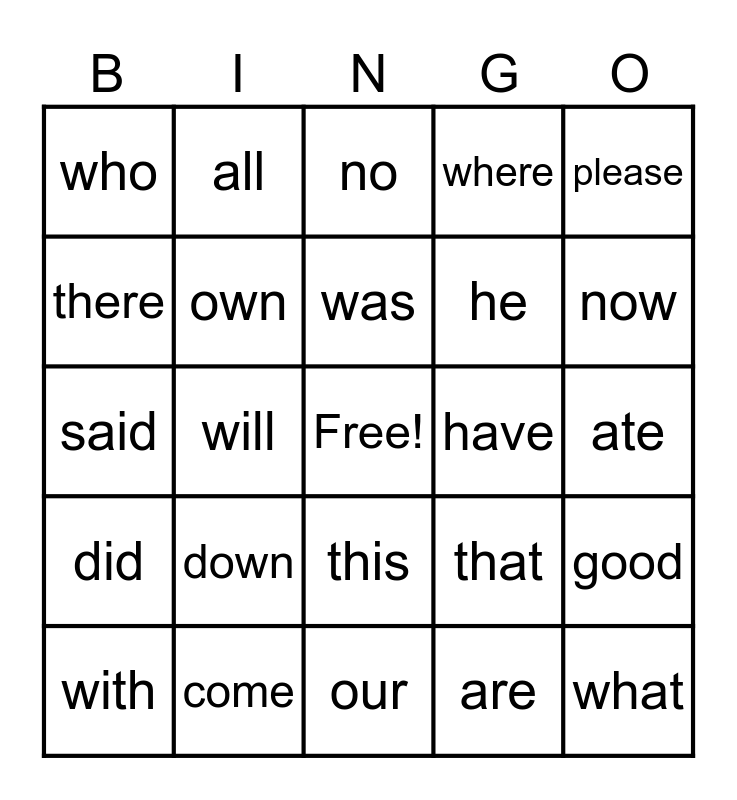 This bingo card has a free space and 34 words: to, are, you, too, did, own, please, with, all, me, was, no, so, say, have, now, come, said, down, that, this, they, who, ate, our, what, where, must, he, there, want, will, good and new.