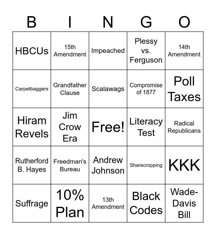 This bingo card has a free space and 24 words: Freedman's Bureau, 10% Plan, Scalawags, Suffrage, 14th Amendment, HBCUs, Carpetbaggers, 15th Amendment, Literacy Test, Andrew Johnson, Compromise of 1877, Hiram Revels, Sharecropping, KKK, Grandfather Clause, Black Codes, Radical Republicans, Impeached, Poll Taxes, Jim Crow Era, Wade-Davis Bill, Rutherford B. Hayes, Plessy vs. Ferguson and 13th Amendment.