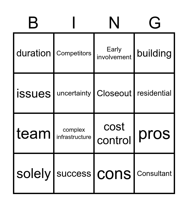 This bingo card has 100 words: Integrate design, Separate design, cons, payment, fail, class, collaborative, bid, coordination, project requirements, approve designs, Government, Time and materials, Lump sum, Overlapping design, construction on phases, team, Subcontractor, diagram, drawing, test, equipment, management, manager, reward, success, issues, affect, effect, benefit, pros, duration, documentation, errors, promotion, residential, entry, loading, teammates, integrating teams, mobilization, Social media platforms, cost control, commercial projects, complex infrastructure, Early involvement, overlapping phases, Design quality, price, team experience, quality control, Encourages innovation, Agreement, Certification, method, organization, delivery, agency, short, building, site, late, Agreement, papers, rest, safety, problems, notice, number, decrease, increase, disable, higher, moment, types, proceed, preference, uncertainty, academic, inspectors, traditionally, solely, exclusively, communication, Project Manual, Competitors, Suppliers, CAD and BIM software, Payroll software, Consultant, project cost, builders, Contract termination, Procurement, Closeout, Design, Construction, Contractor, Owner and Design-Build.
