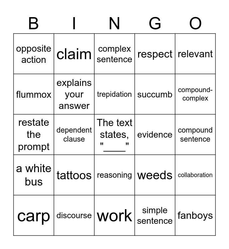 This bingo card has a free space and 24 words: tattoos, discourse, trepidation, carp, relevant, opposite action, flummox, claim, evidence, reasoning, succumb, restate the prompt, weeds, collaboration, explains your answer, simple sentence, compound sentence, complex sentence, compound-complex, dependent clause, fanboys, a white bus, respect and work.