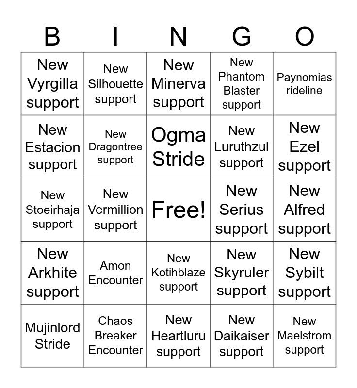 This bingo card has a free space and 24 words: Amon Encounter, Chaos Breaker Encounter, Ogma Stride, Mujinlord Stride, Paynomias rideline, New Vyrgilla support, New Estacion support, New Silhouette support, New Serius support, New Kotihblaze support, New Luruthzul support, New Stoeirhaja support, New Skyruler support, New Sybilt support, New Dragontree support, New Daikaiser support, New Alfred support, New Minerva support, New Ezel support, New Vermillion support, New Maelstrom support, New Arkhite support, New Phantom Blaster support and New Heartluru support.
