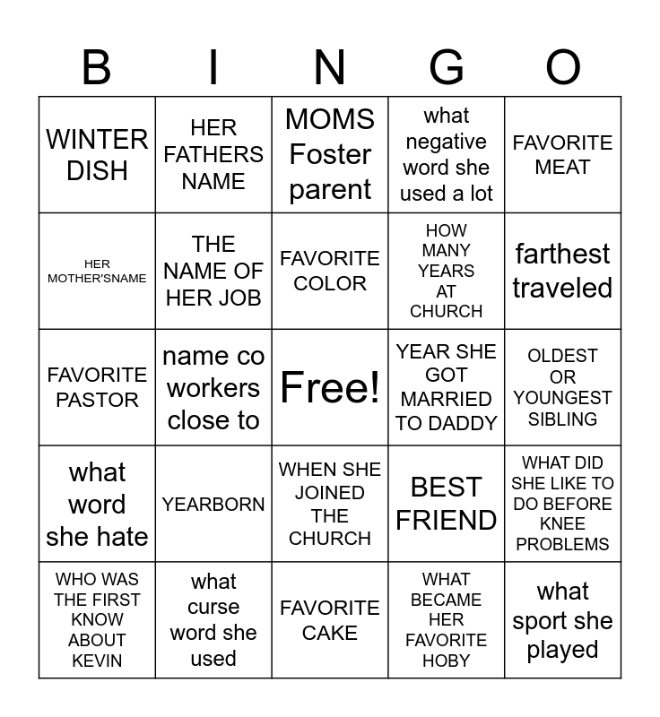This bingo card has a free space and 25 words: YEARBORN, FAVORITE CAKE, FAVORITE COLOR, WHO WAS THE FIRST KNOW ABOUT KEVIN, FAVORITE MEAT, WINTER DISH, HER MOTHER'SNAME, HER FATHERS NAME, YEAR SHE GOT MARRIED TO DADDY, WHEN SHE JOINED THE CHURCH, HOW MANY YEARS AT CHURCH, FAVORITE PASTOR, BEST FRIEND, WHAT DID SHE LIKE TO DO BEFORE KNEE PROBLEMS, THE NAME OF HER JOB, FAVORITE SMOKE /BARBECUE MEAT, OLDEST OR YOUNGEST SIBLING, MOMS Foster parent, farthest traveled, name co workers close to, what sport she played, what curse word she used, what word she hate, what negative word she used a lot and WHAT BECAME HER FAVORITE HOBY.