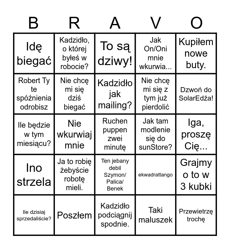 This bingo card has 25 words: Ja to robię żebyście robotę mieli., Kadzidło podciągnij spodnie., Kadzidło jak mailing?, Ile dzisiaj sprzedaliście?, Kupiłem nowe buty., Idę biegać, Robert Ty te spóźnienia odrobisz, Kadzidło, o której byłeś w robocie?, Jak tam modlenie się do sunStore?, Ten jebany debil Szymon/ Palica/ Benek, Nie chcę mi się z tym już pierdolić, Ile będzie w tym miesiącu?, ekwadrattango, Grajmy o to w 3 kubki, Nie chcę mi się dziś biegać, Przewietrzę trochę, Iga, proszę Cię..., To są dziwy!, Dzwoń do SolarEdźa!, Nie wkurwiaj mnie, Ruchen puppen zwei minutę, Poszłem, Ino strzela, Jak On/Oni mnie wkurwia... and Taki maluszek.