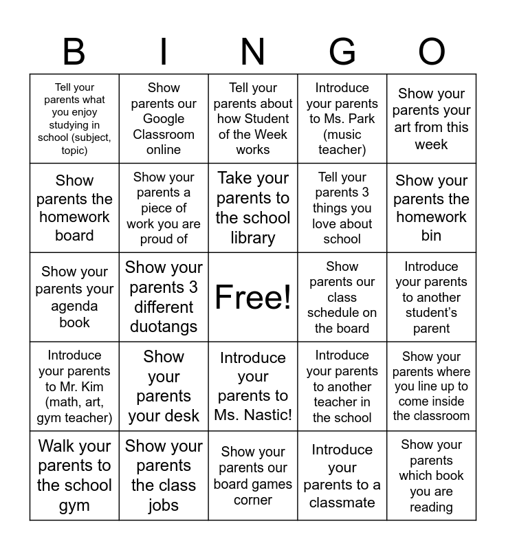 This bingo card has a free space and 24 words: Show your parents your desk, Show your parents the class jobs, Take your parents to the school library, Walk your parents to the school gym, Show your parents your art from this week, Tell your parents what you enjoy studying in school (subject, topic), Show parents the homework board, Show parents our Google Classroom online, Show parents our class schedule on the board, Introduce your parents to Ms. Nastic!, Tell your parents 3 things you love about school, Show your parents your agenda book, Introduce your parents to another teacher in the school, Show your parents where you line up to come inside the classroom, Show your parents a piece of work you are proud of, Introduce your parents to a classmate, Introduce your parents to another student’s parent, Tell your parents about how Student of the Week works, Show your parents the homework bin, Show your parents 3 different duotangs, Show your parents which book you are reading, Introduce your parents to Mr. Kim (math, art, gym teacher), Introduce your parents to Ms. Park (music teacher) and Show your parents our board games corner.