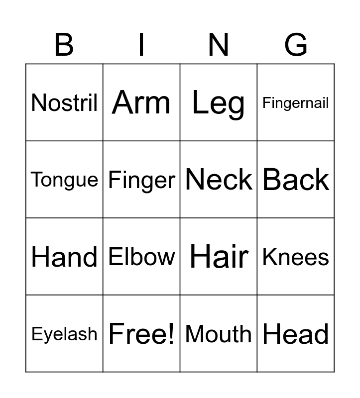 This bingo card has 28 words: Foot, Ankle, Hand, Chest, Finger, Leg, Arm, Head, Free!, Nose, Hair, Fingernail, Toes, Wrist, Elbow, Shin, Nose, Neck, Back, Eyes, Nostril, Eyebrow, Eyelash, Knees, Mouth, Teeth, Tongue and Shoulders.