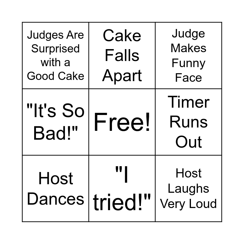 This bingo card has a free space and 14 words: "Nailed It", "Oh no!", Host Dances, Cake Falls Apart, "It's So Bad!", Host Laughs Very Loud, "Wes!", Underbaked Cake, "I tried!", Judges Are Surprised with a Good Cake, "You're done!", Timer Runs Out, Judge Makes Funny Face and "I don't know what I'm doing!".