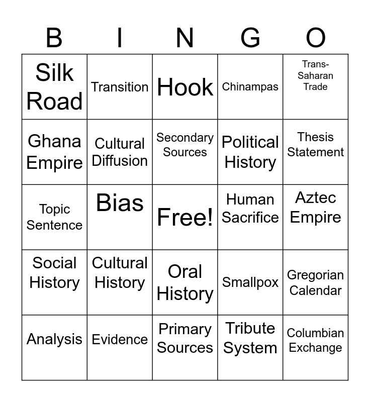 This bingo card has a free space and 25 words: Cultural History, Primary Sources, Secondary Sources, Analysis, Trans-Saharan Trade, Silk Road, Ghana Empire, Transition, Human Sacrifice, Oral History, Political History, Topic Sentence, Smallpox, Gregorian Calendar, Cultural Diffusion, Economic History, Aztec Empire, Hook, Thesis Statement, Bias, Columbian Exchange, Evidence, Social History, Chinampas and Tribute System.