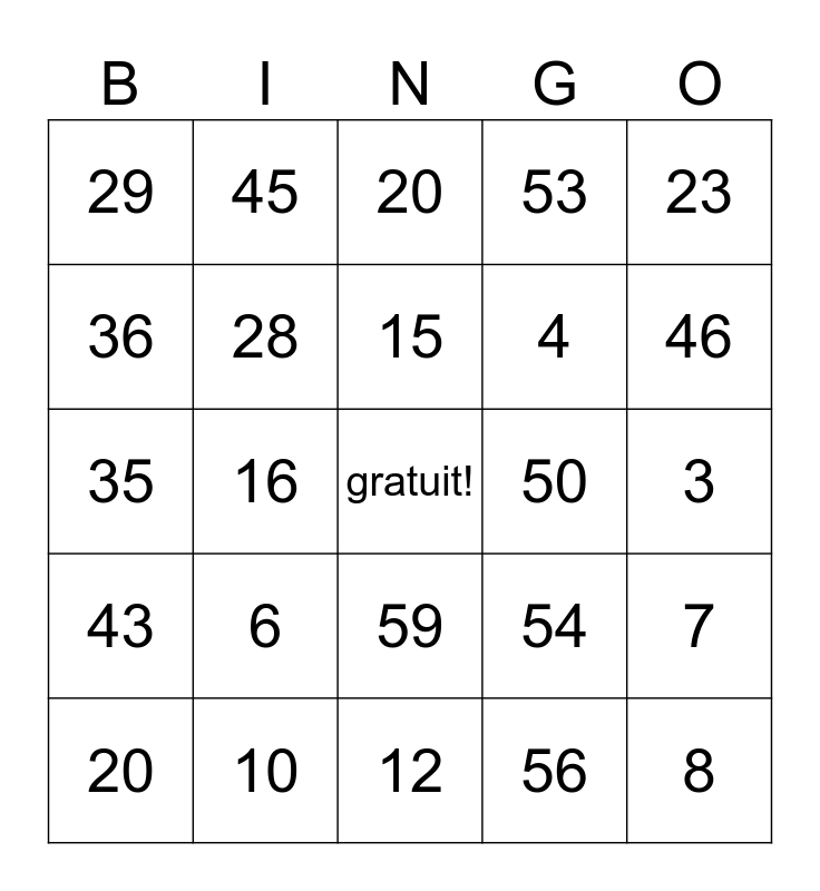 This bingo card has a free space and 24 words: 6, 10, 15, 20, 23, 29, 36, 45, 50, 59, 4, 35, 54, 7, 28, 56, 3, 20, 46, 16, 8, 43, 53 and 12.