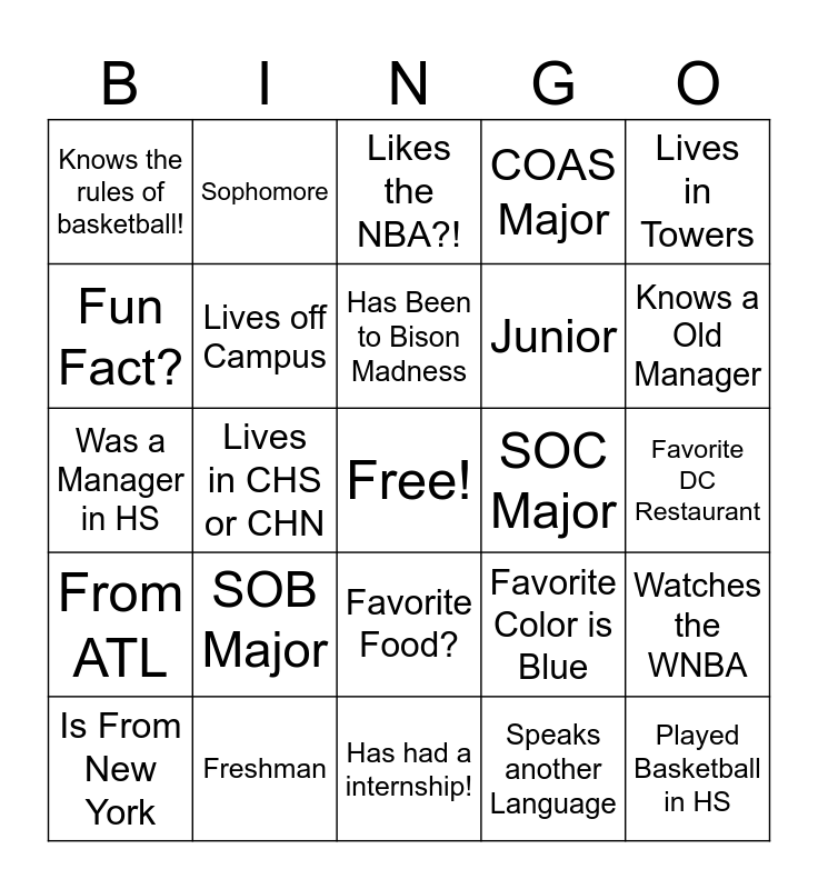 This bingo card has a free space and 24 words: Is From New York, SOB Major, Has Been to Bison Madness, Speaks another Language, Lives in Towers, Knows the rules of basketball!, Sophomore, Likes the NBA?!, SOC Major, Favorite DC Restaurant, Was a Manager in HS, Lives off Campus, Favorite Color is Blue, Watches the WNBA, Fun Fact?, Freshman, Has had a internship!, COAS Major, Knows a Old Manager, From ATL, Lives in CHS or CHN, Favorite Food?, Junior and Played Basketball in HS.