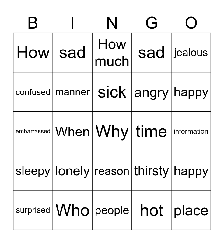 This bingo card has 30 words: Who, What, When, Where, How, How much, manner, reason, time, people, information, Why, hot, place, happy, hungry, thirsty, sleepy, lonely, jealous, embarrassed, proud, sad, angry, confused, sad, happy, surprised, sick and cold.