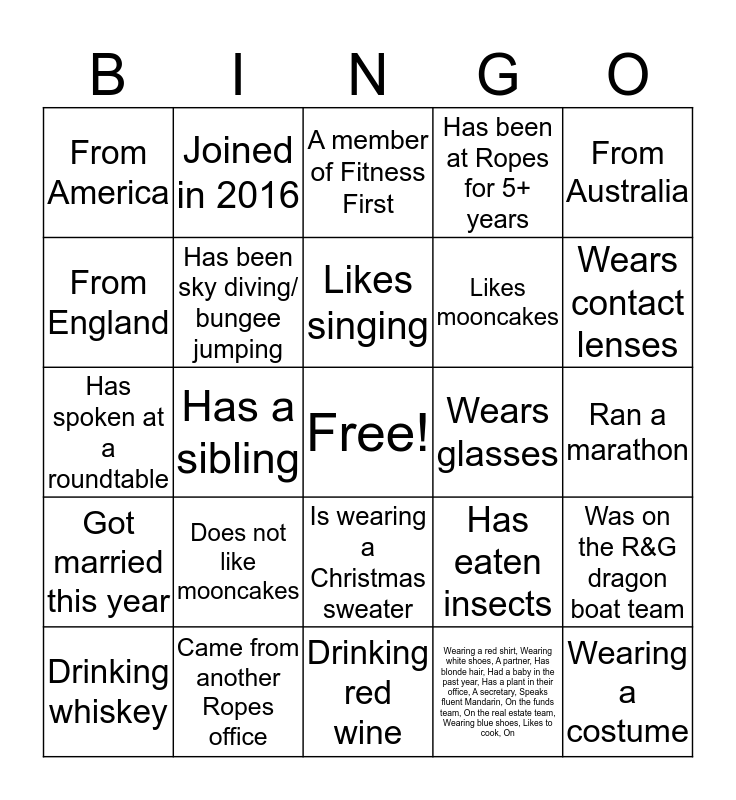 This bingo card has a free space and 25 words: Does not like mooncakes, Drinking red wine, Likes singing, Drinking whiskey, From Australia, From America, From England, Joined in 2016, Wears glasses, Is wearing a Christmas sweater, Likes mooncakes, Has spoken at a roundtable, Has eaten insects, Was on the R&G dragon boat team, Has been sky diving/ bungee jumping, Likes spicy food, Ran a marathon, A member of Fitness First, Wears contact lenses, Has a sibling, Wearing a costume, Came from another Ropes office, Got married this year, Has been at Ropes for 5+ years and Wearing a red shirt, Wearing white shoes, A partner, Has blonde hair, Had a baby in the past year, Has a plant in their office, A secretary, Speaks fluent Mandarin, On the funds team, On the real estate team, Wearing blue shoes, Likes to cook, On.