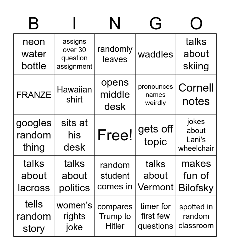This bingo card has a free space and 29 words: tells random story, fat joke, sits at his desk, talks to himself in back, neon water bottle, randomly leaves, Hawaiian shirt, talks about politics, gets off topic, women's rights joke, jokes about Lani's wheelchair, spotted in random classroom, compares Trump to Hitler, timer for first few questions, Cornell notes, makes fun of a student, random student comes in, talks about lacross, talks about skiing, googles random thing, talks about Vermont, says questionable thing, pronounces names weirdly, FRANZE, waddles, assigns over 30 question assignment, makes fun of Bilofsky, opens middle desk and sprays febreeze.