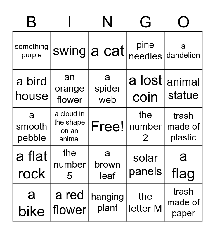 This bingo card has a free space and 40 words: a pine cone, a smooth pebble, a yellow car, an orange flower, a red flower, a brown leaf, a spider web, a stop sign, a dandelion, a flat rock, a cloud in the shape on an animal, pine needles, trash made of paper, trash made of plastic, the number 2, the number 5, a rock shaped like a heart, something purple, something shaped like a triangle, a cat, a flag, the letter M, a lost coin, a bird house, person walking a dog, water hose, windchime, vegetable garden, welcome sign, speed limit sign, recycling bin, a bike, red brick house, solar panels, animal statue, hanging plant, open garage, barking dog, swing and yard gnome.