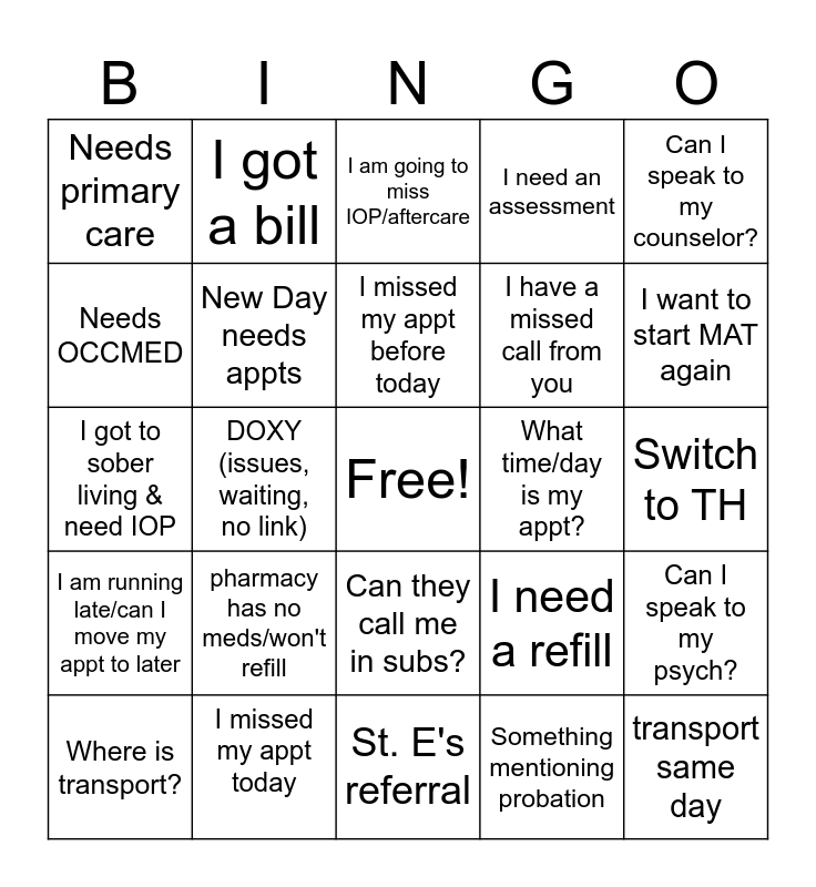 This bingo card has a free space and 24 words: pharmacy has no meds/won't refill, I missed my appt today, I missed my appt before today, Where is transport?, Can I speak to my counselor?, Needs primary care, Needs OCCMED, I got a bill, What time/day is my appt?, Can they call me in subs?, I have a missed call from you, I got to sober living & need IOP, I need a refill, Can I speak to my psych?, New Day needs appts, Something mentioning probation, Switch to TH, I am going to miss IOP/aftercare, I want to start MAT again, DOXY (issues, waiting, no link), transport same day, I am running late/can I move my appt to later, I need an assessment and St. E's referral.