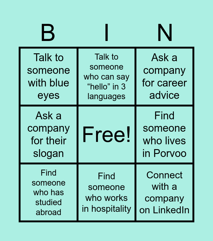 This bingo card has a free space and 11 words: Find someone who studies a different major than you, Find someone who works in hospitality, Connect with a company on LinkedIn, Find someone who has studied abroad, Talk to someone who can say “hello” in 3 languages, Ask a company for career advice, Find someone who lives in Porvoo, Find someone from a different country than you, Ask a company for their slogan, Talk to someone with blue eyes and Find someone who doesn’t live in Porvoo.