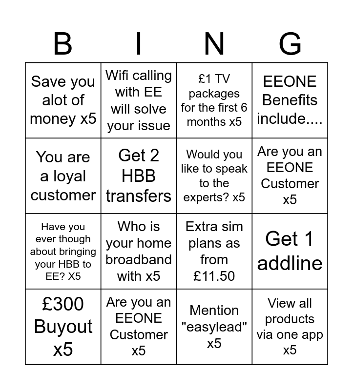 This bingo card has 18 words: Who is your home broadband with x5, View all products via one app x5, £1 TV packages for the first 6 months x5, Save you alot of money x5, Extra sim plans as from £11.50, EEONE Benefits include...., £300 Buyout x5, Wifi calling with EE will solve your issue, Are you an EEONE Customer x5, Have you ever though about bringing your HBB to EE? X5, Mention "easylead" x5, You are a loyal customer, Get 1 addline, Get 2 HBB transfers, Would you like to speak to the experts? x5, Set up easylead x3, Are you an EEONE Customer x5 and Are you enjoying your EEONE Benefits x5.