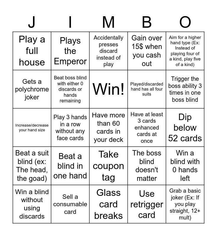 This bingo card has 89 words: Grab a joker tag (ex: Foil tag)Tries to force a hand and fails, Buy a sinful joker (ex: Wrathful), Accidentally presses discard instead of play, Gets noped by wheel of fortune, Wheel of fortune works, Find a Legendary joker, Plays a unique poker hand (ex: five of a kind), Glass card breaks, Transform a card to stone, Didn't do math (ex: thinks it's enough but it's only 90%), Buys/sells a joker, instantly regrets it, Grabs a money joker, Win!, The boss blind doesn't matter, Beat the boss blind without discarding, Beat a suit blind (ex: The head, the goad), Beat a blind in one hand, Have three special edition jokers, Max out interest, Skip at least four blinds, Uses at least 2 spectral card, Skip a pack (ex: Open standard, skips), Have more than 60 cards in your deck, Upgrade a poker hand to level 4, Dip below 52 cards, Have at least 20 of any suit, Play a hand with at least 2 steel playing cards in you hand at once, Sell 3 jokers, High priestess gives most played hand, Gets a negative joker, Gets a polychrome joker, Beat boss blind with either 0 discards or hands remaining, Reroll a boss blind, Gain over 15$ when you cash out, Play a straight, Play a full house, Plays the Emperor, Use the fool, Have at least 3 cards enhanced cards at once, Use a certain type of seal three times, Standard pack had no enchanted cards, Sell a consumable card, Find a rare joker, None of your jokers are common (Doesn't count for ante 1), Grab a basic joker (Ex: If you play straight, 12+ mult), Sell a joker to make room for a better one, Have three of the same card in your deck, Play three of same hand type in a row (You may discard), Use Judgement, Aim for a higher hand type (Ex: Instead of playing four of a kind, play five of a kind), Discard a hand type higher than a two pair, Play a two pair, Play a three of a kind, Two packs in the shop are the same type (Ex: A Mega celestial pack and a jumbo celestial pack), Play a hand with only face cards, Purchase a joker that can destroy itself (Ex: Popcorn), Play a hand with only four cards, Take coupon tag, Have five aces in your deck, Have a lucky card work, Have every type of seal in your deck at once, Increase/decrease your hand size, Have over 200 chips before mult, Have over 800 mult, Play a hand type 16 times, Have every type of enchanted card in your deck at once, Use 8 tarot cards, Play a hand with three or fewer cards, Use retrigger card, Win a blind with 0 hands left, Win a blind without using discards, Play 3 hands in a row without any face cards, Played hand has three different suites, Played/discarded hand has all four suits, Trigger the boss ability 3 times in one boss blind, Beat a big blind without repeating a hand, Beat a blind without playing five cards at once, Obtain 3 vouchers, Open 10 packs, Get 30 in mult without before any xmult, Increase/decrease your hand size, Play high card, Have all cards in a standard pack have a seal or enchantment, Use 6 planet cards, Have an edition and enchantment on one card, Take a double tag, D6 tag, orbital tag, or voucher tag, Take a tag that grants money (ex: Speed tag), Use two wild card in one hand and Beat the small blind in one hand.