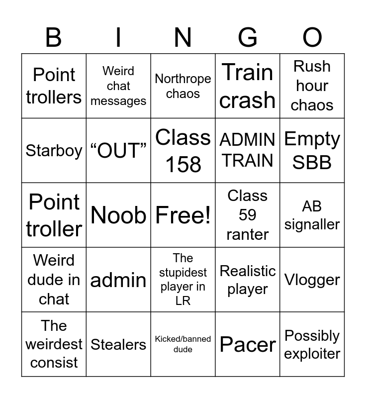 This bingo card has a free space and 24 words: admin, Stealers, Class 158, The weirdest consist, Rush hour chaos, Point trollers, Starboy, Weird chat messages, Class 59 ranter, The stupidest player in LR, ADMIN TRAIN, Point troller, Realistic player, Vlogger, “OUT”, Pacer, AB signaller, Northrope chaos, Empty SBB, Noob, Possibly exploiter, Weird dude in chat, Train crash and Kicked/banned dude.