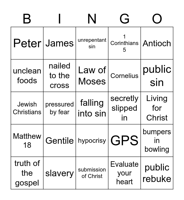 This bingo card has a free space and 24 words: Gentile, slavery, Law of Moses, truth of the gospel, Antioch, Peter, unclean foods, James, secretly slipped in, hypocrisy, Cornelius, Jewish Christians, GPS, bumpers in bowling, nailed to the cross, Evaluate your heart, Living for Christ, unrepentant sin, public sin, pressured by fear, public rebuke, Matthew 18, 1 Corinthians 5 and submission of Christ.