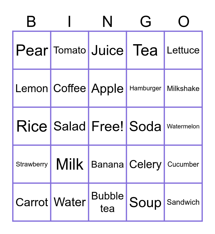 This bingo card has a free space and 24 words: Milk, Water, Apple, Carrot, Lettuce, Pear, Lemon, Tomato, Soda, Banana, Hamburger, Rice, Celery, Cucumber, Coffee, Soup, Watermelon, Juice, Milkshake, Salad, Sandwich, Strawberry, Tea and Bubble tea.