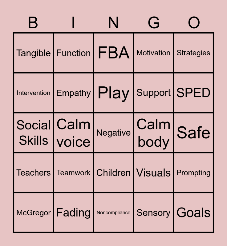 This bingo card has 49 words: Positive Reinforcement, Negative, Physical Aggression, Noncompliance, Teamwork, Communication, Function, Power Struggle, Intervention, Documentation, Empathy, Motivation, Prompting, Visuals, Cool down, Dysregulated, Play, Calm body, Expectations, Strategies, Calm voice, Sensory, Tangible, Support, IEP, SPED, McGregor, Tokens, Children, Teachers, Paras, Emotions, Snack, Choices, Fading, Breaks, Responsible, Kind, Safe, Choice Menu, Escape, Helper, Goals, Reflection, Social Skills, FBA, Behavior Management, Candy and Habit.