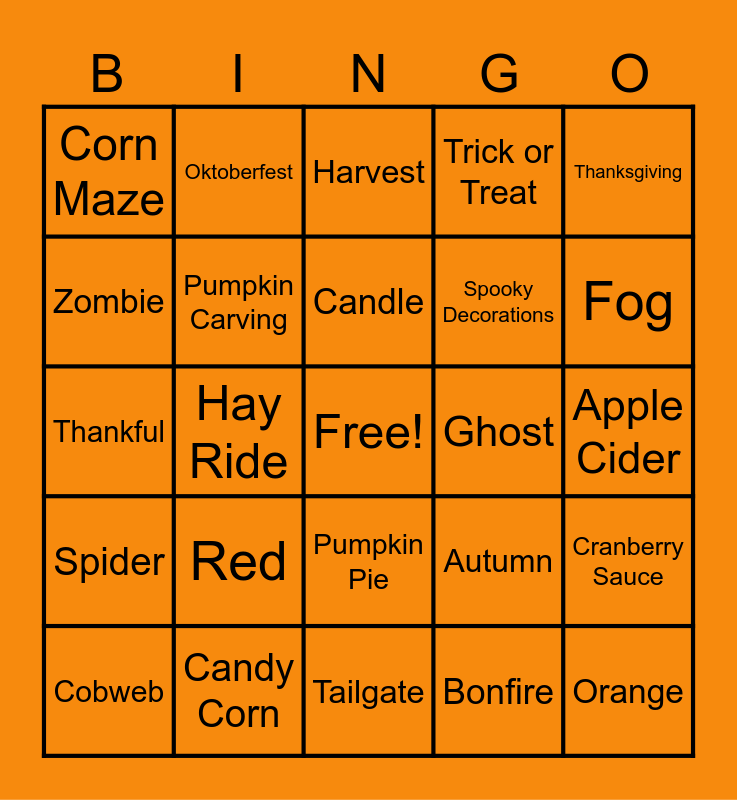 This bingo card has a free space and 69 words: Leaves, Apple Cider, Pumpkin, Halloween, Candy Corn, Costumes, Trick or Treat, Pumpkin Bread, Thanksgiving, Turkey, Cranberry Sauce, Apple Pie, Corn Maze, Harvest, Haunted House, Hay Ride, Pumpkin Pie, Spooky Decorations, Bat, Spider, Ghost, Autumn, Fog, Sweater Weather, Black Cat, Equinox, Cornucopia, Acorn, Bonfire, Hibernate, Oktoberfest, Jack O'Lantern, S'mores, Scarecrow, Squash, Skeleton, Stuffing, Witch's Brew, Zombie, Yellow, Red, Orange, Crisp air, Soup Season, Gourd, Cobweb, Candy Apple, Popcorn, Boots, Pumpkin Carving, Candle, Leaf Peeping, Football, Tailgate, Rake, Owl, Denver Broncos, Green Bay Packers, Minnesota Vikings, Thankful, Kansas City Chiefs, Squirrel, Pinecone, Baking, Orchard, Farmer's Market, Kettle Corn, Fireplace and Pumpkin Spice Latte.