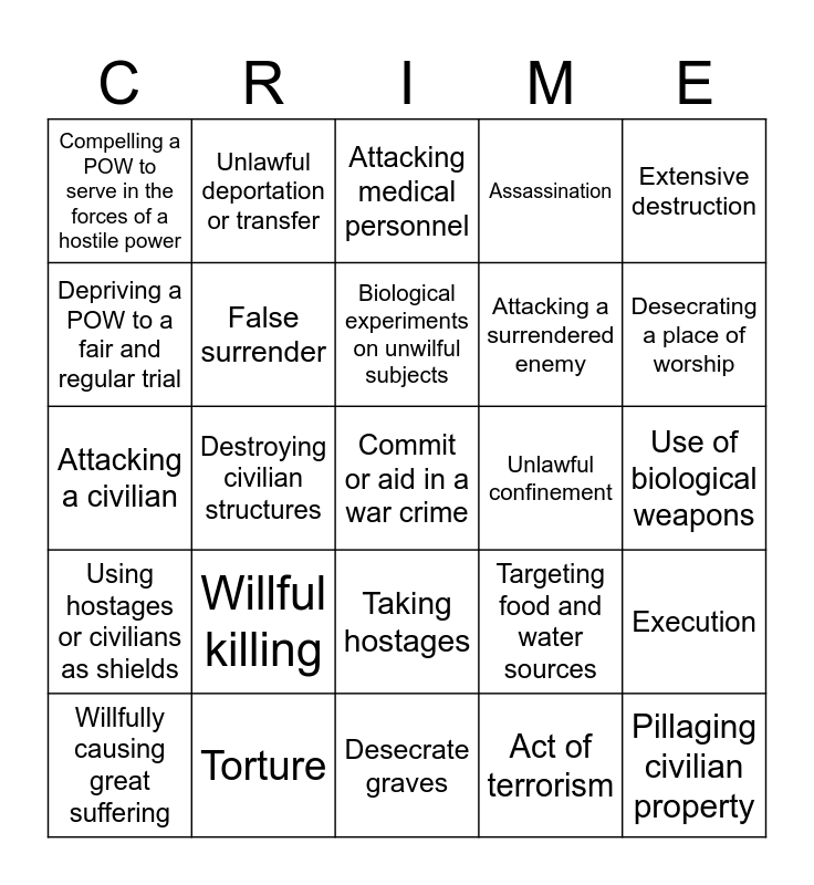 This bingo card has a free space and 24 words: Willful killing, Torture, Biological experiments on unwilful subjects, Willfully causing great suffering, Extensive destruction, Compelling a POW to serve in the forces of a hostile power, Depriving a POW to a fair and regular trial, Unlawful deportation or transfer, Unlawful confinement, Taking hostages, Attacking a surrendered enemy, Attacking a civilian, Targeting food and water sources, Execution, False surrender, Act of terrorism, Use of biological weapons, Attacking medical personnel, Desecrating a place of worship, Destroying civilian structures, Pillaging civilian property, Using hostages or civilians as shields, Assassination and Desecrate graves.
