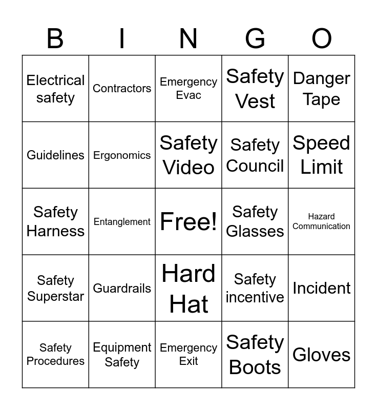 This bingo card has a free space and 45 words: Safety Goggles, Gloves, First aid kit, Safety Procedures, LOTO, Safety Boots, Emergency Evac, Fire system, Danger Tape, Equipment Safety, Safety Vest, Safety Glasses, Hard Hat, Guardrails, MSDS, Emergency Exit, Machine guarding, Safety Harness, Safety Committee, Speed Limit, Contractors, Seat Belts, Signage, Electrical safety, Hot work, Hazard Communication, Training, Ladder Safety, Safety incentive, Safety Superstar, Near Miss, Incident, Recordable, OSHA, MNStar, Entanglement, PPE, Safety Awareness, Audits, Safety Video, Guidelines, Safety Council, Confined Space, Ergonomics and Catwalks.