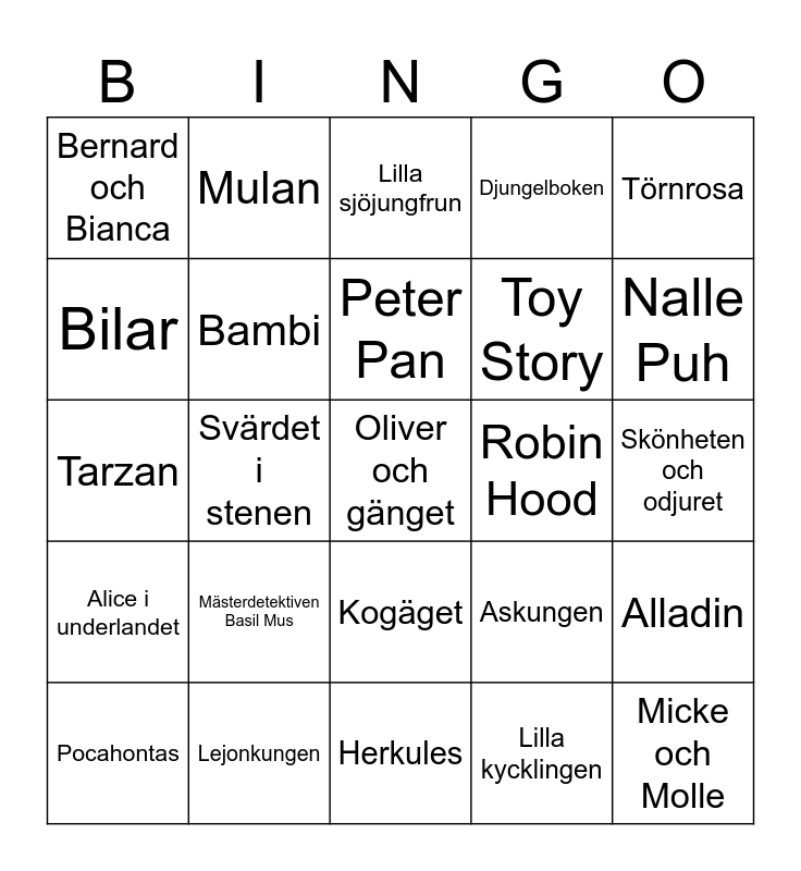 This bingo card has 36 words: Snövit, Pinocchio, Dumbo, Bambi, Askungen, Alice i underlandet, Peter Pan, Lady och Lufsen, Törnrosa, De 101 dalmatinerna, Svärdet i stenen, Djungelboken, Aristocats, Robin Hood, Nalle Puh, Bernard och Bianca, Micke och Molle, Mästerdetektiven Basil Mus, Oliver och gänget, Lilla sjöjungfrun, Skönheten och odjuret, Alladin, Lejonkungen, Pocahontas, Herkules, Mulan, Tarzan, Atlantis, Toy Story, Bilar, Hitta Nemo, Monsters, Lilla kycklingen, Kogäget, Björnbröder and Lilo och Dtitch.