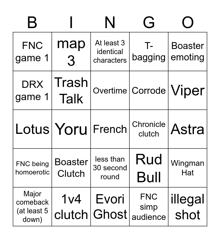 This bingo card has a free space and 24 words: Boaster Clutch, 1v4 clutch, Overtime, Major comeback (at least 5 down), Boaster emoting, FNC game 1, DRX game 1, map 3, Chronicle clutch, less than 30 second round, Corrode, Lotus, Rud Bull, Wingman Hat, Trash Talk, FNC simp audience, Astra, At least 3 identical characters, Viper, Yoru, illegal shot, FNC being homoerotic, T-bagging and Evori Ghost.