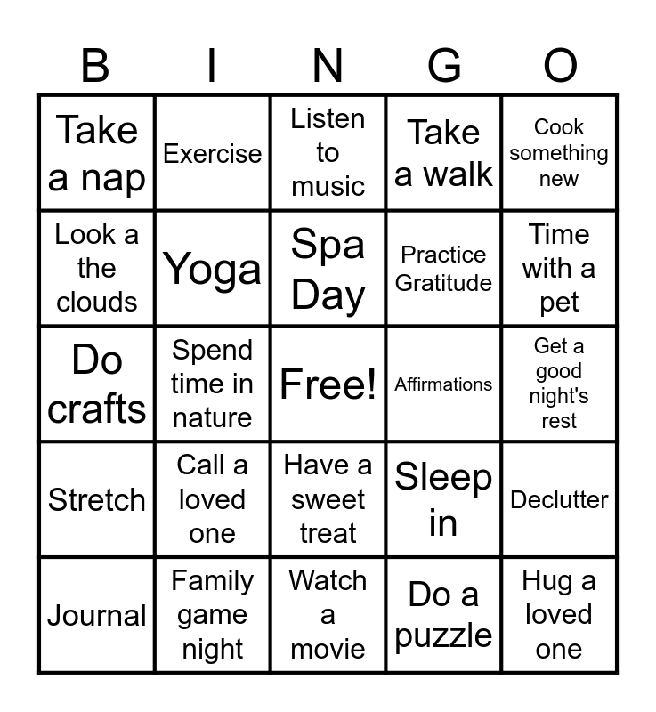 This bingo card has a free space and 29 words: Journal, Read a book, Spend time in nature, Take a digital detox, Take a nap, Listen to music, Yoga, Call a loved one, Affirmations, Family game night, Get a good night's rest, Hug a loved one, Watch a movie, Do a puzzle, Time with a pet, Grounding exercise, Have a sweet treat, Stretch, Cook something new, Do crafts, Sleep in, Meditate, Practice Gratitude, Look a the clouds, Take a walk, Exercise, Declutter, Spa Day and Drink Water.