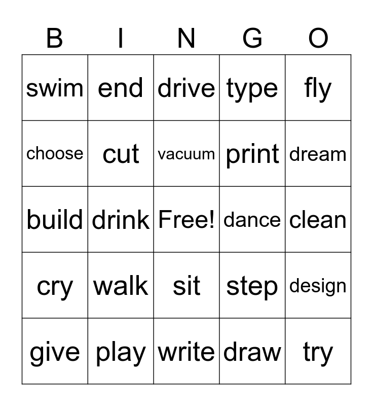 This bingo card has a free space and 29 words: give, stop, drink, eat, swim, drive, cut, walk, dance, play, clean, try, write, draw, dream, stand, sit, cry, fly, build, step, talk, print, choose, type, end, design, vacuum and pour.