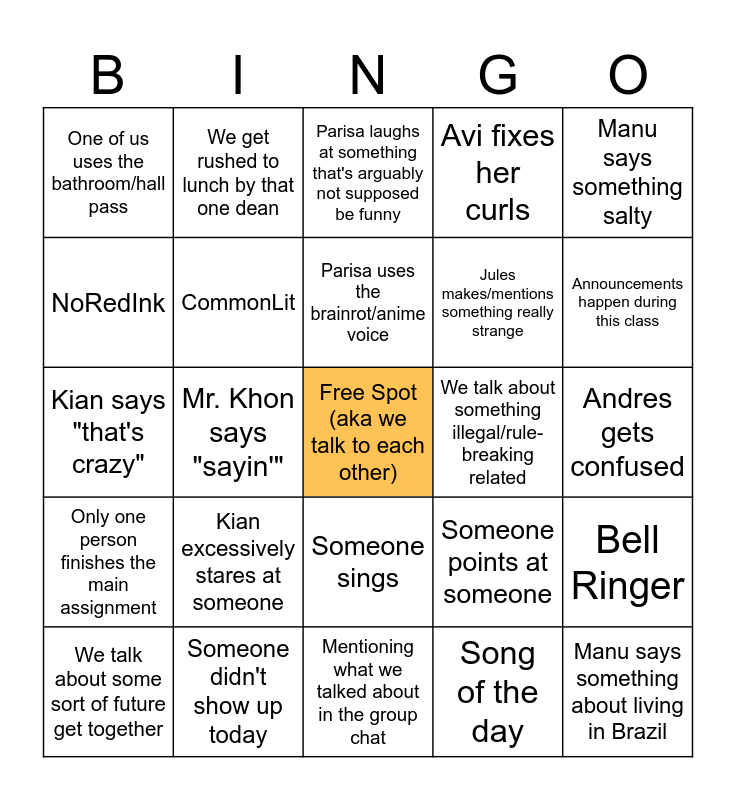 This bingo card has 38 words: "To what extent...", Mentions of AI, We need to reread something for Andres, CommonLit, Bell Ringer, Kian excessively stares at someone, Parisa uses the brainrot/anime voice, Avi tells us to hush so that she can focus, Manu says something salty, Jules makes/mentions something really strange, Mr. Khon says "sayin'", Avi fixes her curls, Free Spot (aka we talk to each other), Andres gets confused, NoRedInk, Only one person finishes the main assignment, Mr. Kohn tells us to shush, Parisa laughs at something that's arguably not supposed be funny, We talk about another class, We talk about something illegal/rule-breaking related, One of us uses the bathroom/hall pass, Someone didn't show up today, Announcements happen during this class, We talk about some sort of future get together, We use laptops!, Mentioning what we talked about in the group chat, Manu says something about living in Brazil, Jules writes in her personal journal, Two conversations start happening at once, MBTI MENTIONED, Parisa fidgets with something, Someone sings, Song of the day, We get rushed to lunch by that one dean, Mr. Kohn asks if we know what we're doing, Someone points at someone, Kian says "that's crazy" and Kian judges us for not doing work.