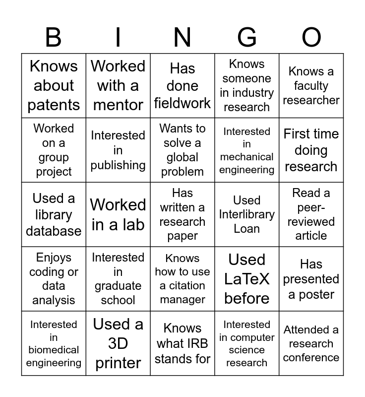 This bingo card has a free space and 24 words: Interested in graduate school, Used a 3D printer, Wants to solve a global problem, Interested in biomedical engineering, Knows a faculty researcher, Knows about patents, Worked on a group project, Worked with a mentor, Used Interlibrary Loan, Knows how to use a citation manager, Interested in mechanical engineering, Used a library database, Used LaTeX before, Has presented a poster, Interested in publishing, Interested in computer science research, Read a peer-reviewed article, Has done fieldwork, First time doing research, Worked in a lab, Attended a research conference, Enjoys coding or data analysis, Knows someone in industry research and Knows what IRB stands for.