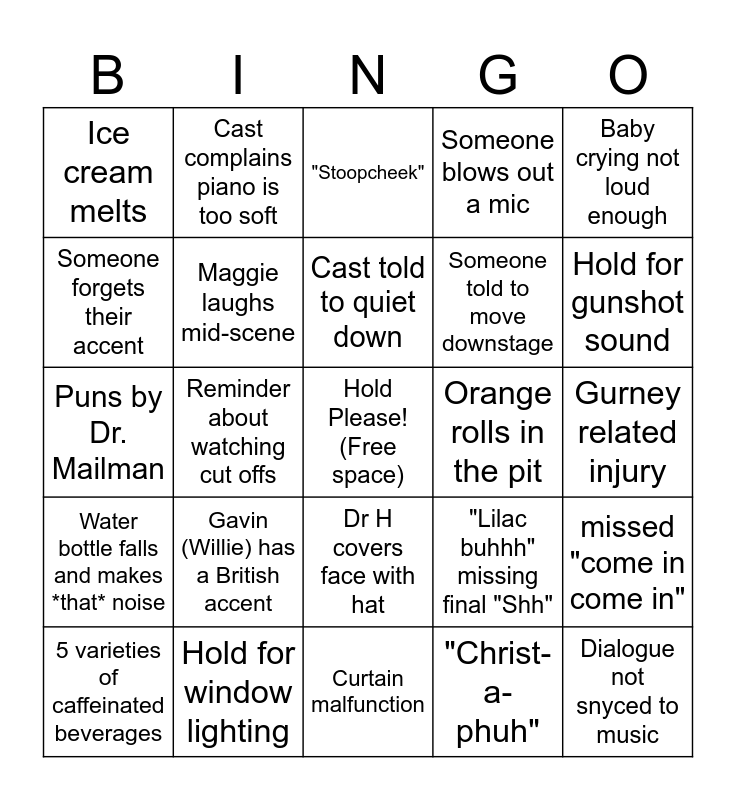 This bingo card has a free space and 27 words: "Lilac buhhh" missing final "Shh", "That's comedy", Someone told to move downstage, Curtain malfunction, Someone forgets their accent, "Stoopcheek", Cast complains piano is too soft, Water bottle falls and makes *that* noise, Orange rolls in the pit, missed "come in come in", Puns by Dr. Mailman, Someone blows out a mic, 5 varieties of caffeinated beverages, Hold for window lighting, Hold for gunshot sound, Someone eating cheezits, Maggie laughs mid-scene, Cast told to quiet down, Gavin (Willie) has a British accent, Ice cream melts, Gurney related injury, "Christ-a-phuh", Reminder about watching cut offs, Dialogue not snyced to music, Dr H covers face with hat, Baby crying not loud enough and "One Herendeen width".