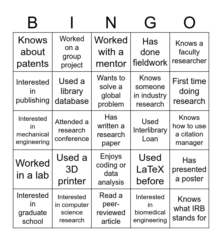 This bingo card has a free space and 24 words: Interested in graduate school, Used a 3D printer, Wants to solve a global problem, Interested in biomedical engineering, Knows a faculty researcher, Knows about patents, Worked on a group project, Worked with a mentor, Used Interlibrary Loan, Knows how to use a citation manager, Interested in mechanical engineering, Used a library database, Used LaTeX before, Has presented a poster, Interested in publishing, Interested in computer science research, Read a peer-reviewed article, Has done fieldwork, First time doing research, Worked in a lab, Attended a research conference, Enjoys coding or data analysis, Knows someone in industry research and Knows what IRB stands for.