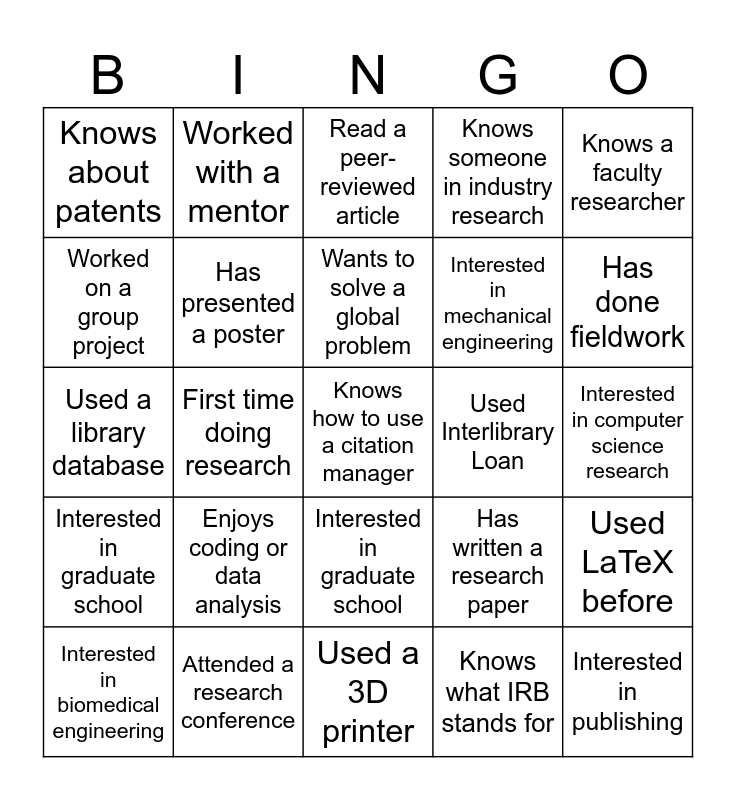This bingo card has 25 words: Enjoys coding or data analysis, Used a 3D printer, Wants to solve a global problem, Interested in biomedical engineering, Knows a faculty researcher, Knows about patents, Worked on a group project, Worked with a mentor, Used Interlibrary Loan, Interested in graduate school, Interested in mechanical engineering, Used a library database, Has written a research paper, Used LaTeX before, Has presented a poster, Interested in publishing, Interested in computer science research, Read a peer-reviewed article, Has done fieldwork, First time doing research, Knows how to use a citation manager, Attended a research conference, Interested in graduate school, Knows someone in industry research and Knows what IRB stands for.