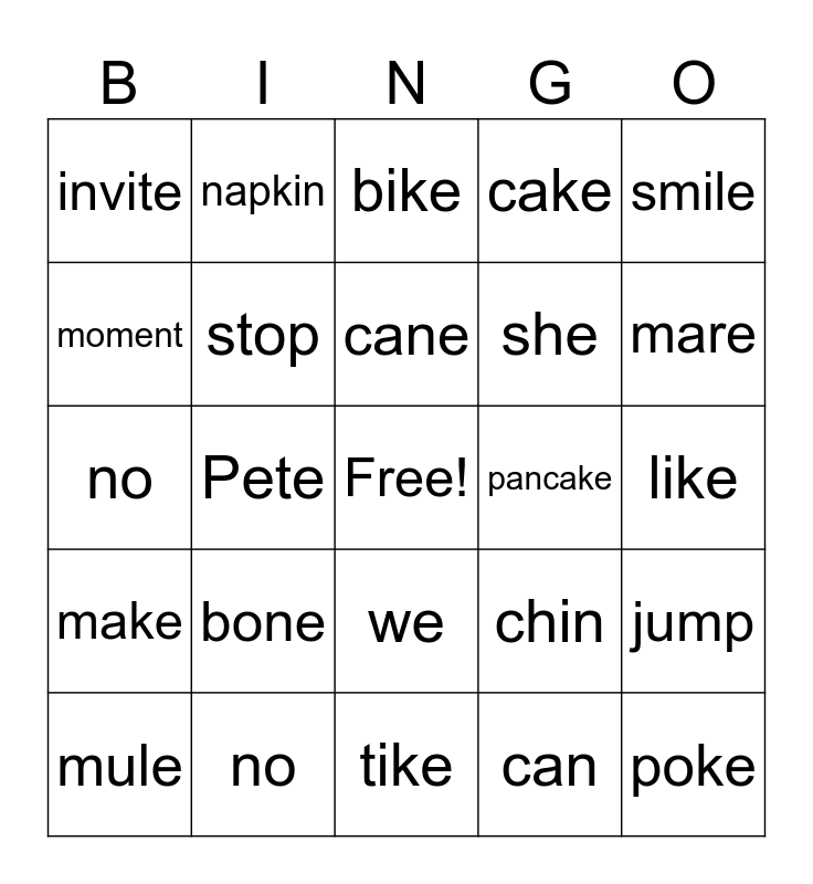 This bingo card has a free space and 24 words: bone, no, cane, mule, smile, invite, moment, napkin, pancake, we, she, no, chin, jump, stop, can, like, bike, mare, Pete, poke, make, cake and tike.